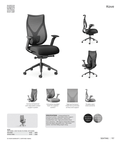 SPECIFICATIONS Contoured back for maximum comfort | Adjustable lumbar support | Durable nylon shell and arms | Heavy duty moulded foam seat | High performance mesh back upholstery | 360 degree independent height, pivot and depth adjustable arms | Seat slider control | Certified 160kg weight ratingKOVEWIDTH 680MM | HEIGHT 500-600/1170-1270MM | DEPTH 660MMWITH ARMS KV100 $678WITHOUT ARMS KV110 $638Black Seat & Back/Black Details Grey Seat & Back/Grey DetailsContoured backrest with adjustable lumbar support systemHigh performance mesh back promotes airflow and supportInnovative moulded foam for superior comfortDurable nylon shell and arms SEATING | 117Kove10 YEAR WARRANTY | CERTIFIED 160KG
