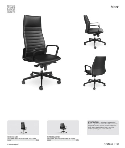 SPECIFICATIONS Lockable in any position | Tension adjustment control | Knee tilt mechanism | Height adjustable | Tapered powder coated loop arms | Black powder coated base | Synthetic leather upholstery and contoured shellMARC HIGH BACKWIDTH 660MM | HEIGHT 430-500/1160-1230MM | DEPTH 700MMMC100 $499MARC MEDIUM BACKWIDTH 660MM | HEIGHT 430-500/950-1010MM | DEPTH 700MMMC105 $4795 YEAR WARRANTY SEATING | 135Marc