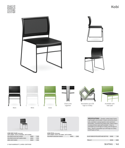 Chairs link togetherStackable up to 25 high on trolleyAvailable with seat padSPECIFICATIONS Powder coated steel frame | Lightweight and durable | Green and white chairs only available in polypropylene seat and back | Stackable | Commercial grade mesh | Black fabric or polyurethane seat pad available | Chair is stackable up to 25 high on trolley and 15 high on floor | Stool is stackable up to 25 high on trolley and 8 high on floorKOBI SIDE CHAIR STACKABLEWIDTH 490MM | HEIGHT 475/830MM | DEPTH 530MMPOLYPROPYLENE SEAT & BACK KB100 $149POLYPROPYLENE SEAT & MESH BACK KB110 $174MESH SEAT & BACK KB120 $194BLACK FABRIC OR POLYURETHANE SEAT PAD KB180 $44TROLLEY KB190 $299KOBI STOOL STACKABLEWIDTH 558MM | HEIGHT 765/1136MM | DEPTH 595MMPOLYPROPYLENE SEAT & BACK KB150 $232Black White Green5 YEAR WARRANTY | AFRDI CERTIFIEDKobi SEATING | 145