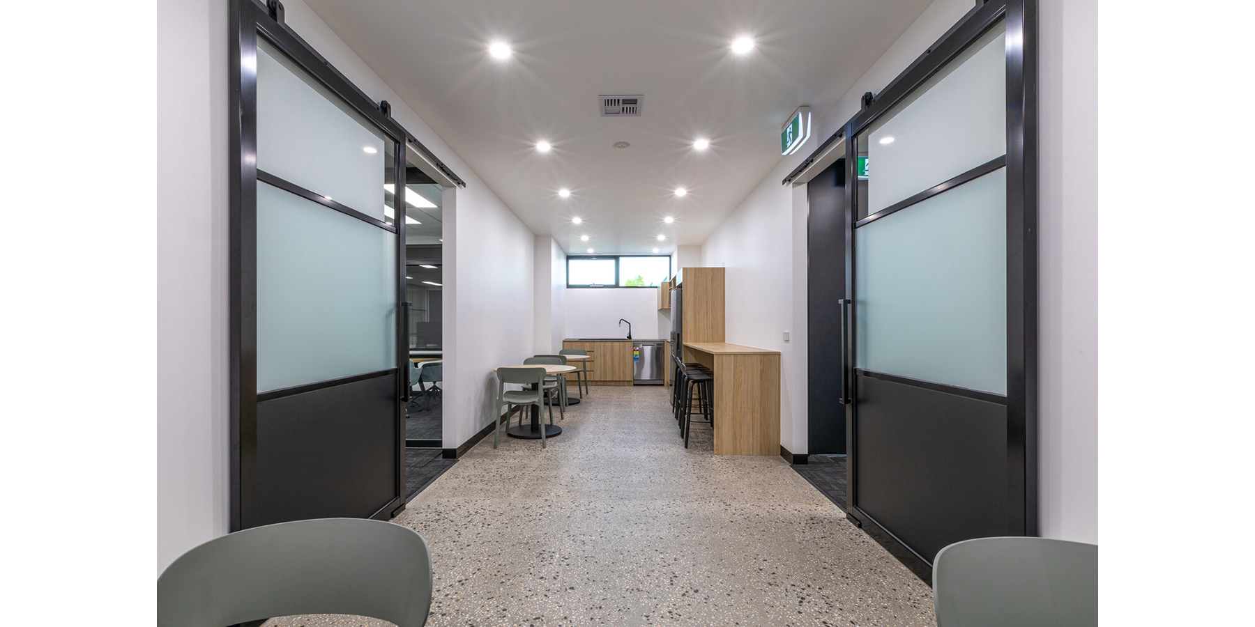 The staff lunchroom was brought to life with a custom made kitchen that integrates a mix of bench space, storage and a counter for the team. Poppi chairs, Indi stools, Mix bench seating and Halo tables further enhance the space, providing an enticing breakout zone.
