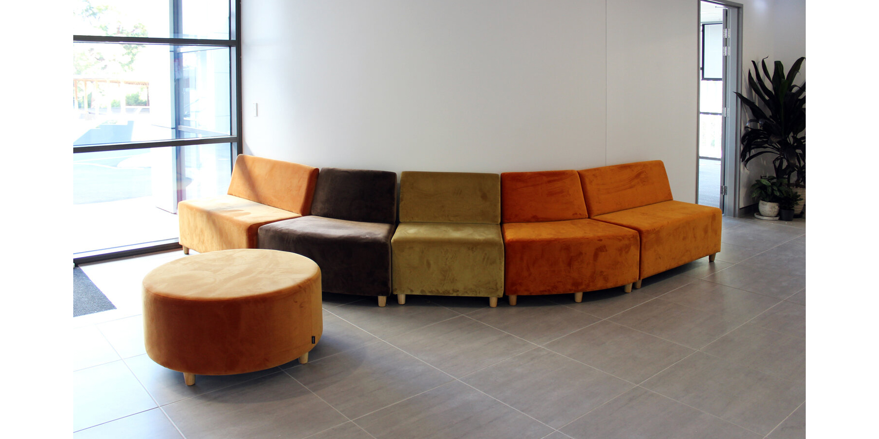 A palette of orange, yellow, green and brown reminiscent of autumn cover our Sofi ottomans, providing soft seating areas. Adapting to the curved architectural details of the room, our Sofi ottomans were custom designed in shape to wrap seamlessly around the wall creating an eclectic and earthy yet welcoming environment.