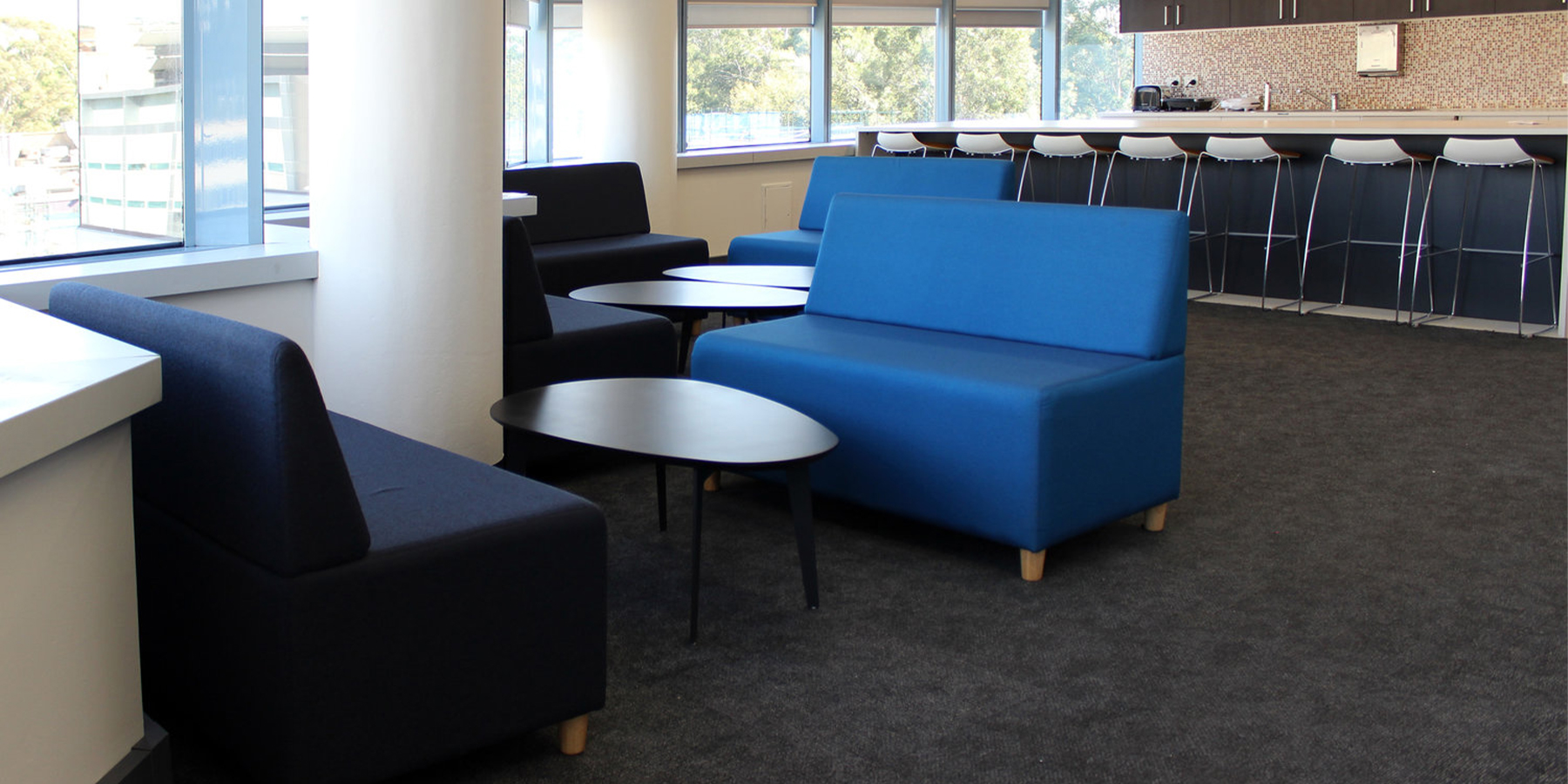 Moving into the kitchen and lunch area, our Sofi lounges and Dart organic tables form pods of soft seating. Upholstered in contrasting blue tones, a more playful atmosphere has been created.