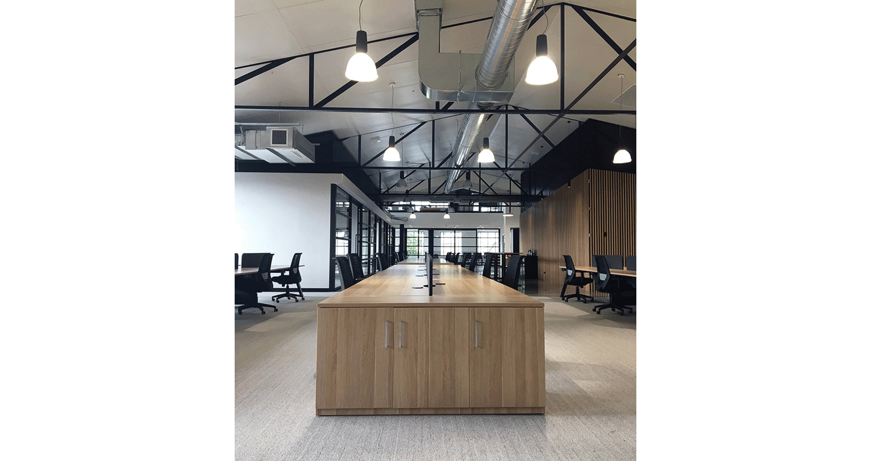 Seeking a space to run their national HQ, Stratosphere Advertising required an environment that encapsulated creativity, professionalism and innovation. Drawing inspiration from a neutral industrial palette we worked with Stratosphere to create a workspace that possesses all the qualities that a growing, fast paced company requires to succeed. Utlising the generous office space, the area was filled with runs of our Keywork workstations, perfectly paired with Local screens, Space chairs and wood grain Universal hinge door units. The finished result of the open office is nothing short of impressive with its standout wood grain features, exposed ceiling beams, industrial style lights and mix of flooring finishes. The light-filled boardroom hosts a Velo table and Sax chairs in a colour selection that tied in with the rest of the workspace whilst meeting rooms featured Dart tables with some fun Tang chairs. From open working areas, to boardrooms, breakout spaces and executive offices alike – every space has been carefully planned to create a a fun, cohesive and supremely functional workspace.